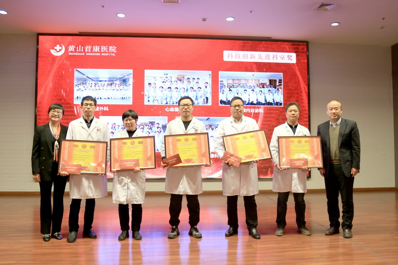 院长贾全章、常务副院长许友芬为科技创新先进科室:普外科、心血管内科、血液内分泌科、骨科、医学影像科颁奖。