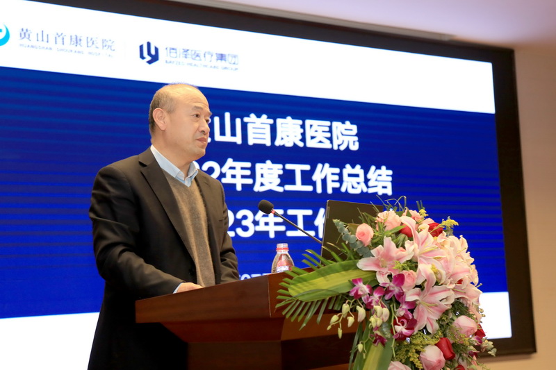 王彦杰总经理发表讲话,首先肯定了医院克服疫情和医疗市场竞争等种种困难,依旧稳中有升,取得良好成绩。在感谢全院员工共同努力的同时,王彦杰总经理对2023年医院的新发展充满信心。他表示,佰泽医疗集团将在设施设备、信息化建设等方面持续赋能,确保临床医疗需求,也祝全体员工工作顺利,再创佳绩。