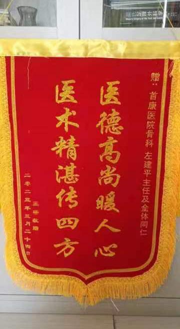 王某是骨科患者,因左肱骨髁间骨折术后一年要求取内固定入院。一年前,王某因走路滑倒致左肱骨髁间骨折来院就诊,术后痊愈出院。目前王某已恢复正常生活,为表感谢,送来锦旗一面感谢骨科左建平医生及全体骨科医护人员。