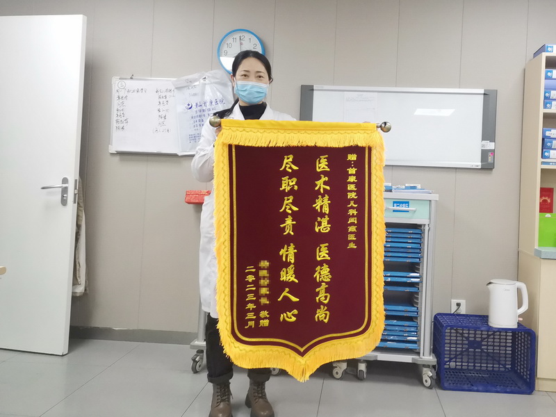 患儿杨某刚刚出生就因黄疸伴口腔疱疹住进了新生儿科,在新生儿科室护士阿姨们的细心呵护下痊愈出院。好景不长,出生后的第28天,宝宝因感染新冠病毒引起肺炎再次住院。面对还未足月的宝宝,家长十分焦急,闫燕医生治疗宝宝病情的同时,耐心地排除家长的焦虑。宝宝痊愈后,家长为表达感谢之情,特意寄来锦旗一面感谢闫燕医生。