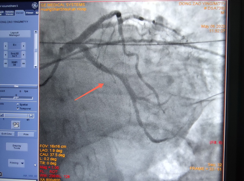 心内科主任吴捷华带领团队给董爷爷实施冠脉造影,显示回旋支完全闭塞伴血栓影,确定了回旋支是罪犯血管。医生们立即给董爷爷行冠脉内血栓抽吸和冠脉内溶栓,术中抽吸出几个较大的暗红色血栓。