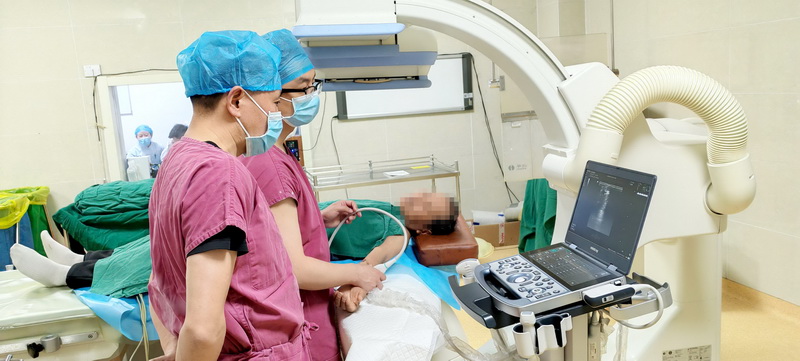 在超声引导下,丁磊主任经皮穿刺血管,置入穿刺鞘,经导管直达病变部位进行尿激酶溶栓,置入导丝,沿导丝将球囊输送至血管狭窄病变处,再使用压力泵打开球囊,将狭窄的病变扩张。