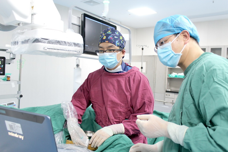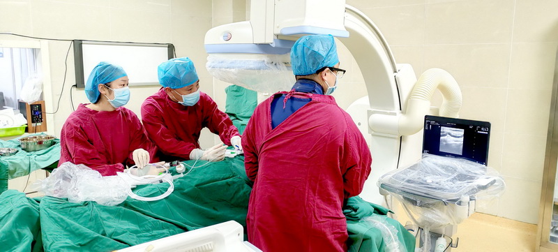 经与关先生家属沟通,排除手术禁忌并完善术前准备后,丁磊主任与陶胜来主任在介入科团队的配合下,在介入室为关先生进行手术。